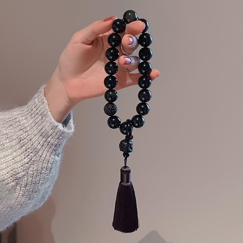 Cross-border original natural obsidian and silver obsidian hand-held 18-bead tassel lucky prayer beads bracelet for the Year of the Rabbit and the zodiac year